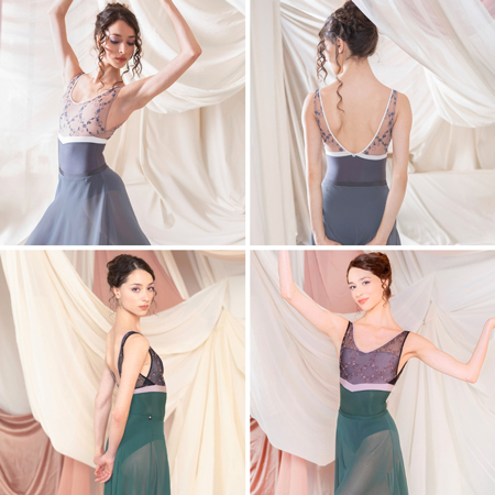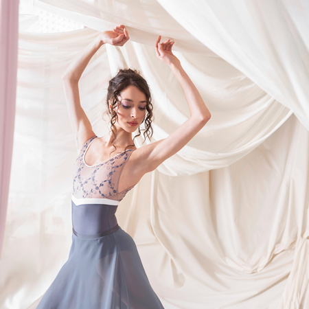 革新的な素材使いと洗練されたシルエットが、ダンサーの存在感を美しく引き立て、動きをしなやかにサポートします。